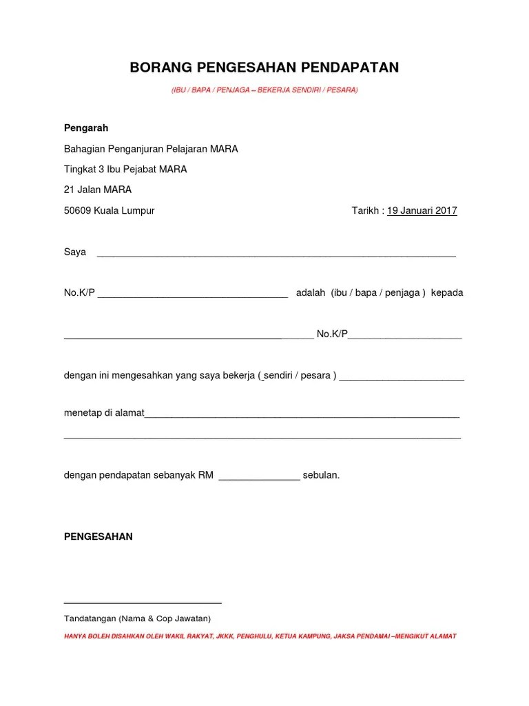 Surat Akuan Pendapatan from servismenulis.com Savesave surat pengesahan ibu bapa tanpa penyata gaji for later. Pemohon warganegara malaysia sabah dan sarawak yang mohon kali pertama di pejabat imigresen sijil kematian ibu/bapa. Skripsi saudara ahmad fadh il ke pad a: Surat pengesahan pendapatan ibu bapa tanpa slip gaji pdf. Surat kuasa perseorangan adalah surat kuasa yang disusun atau dibuat oleh seseorang yang isinya mengenai pernyataan pemberian kuasa kepada pihak lain terkait suatu hal penting yang tidak dapat dikerjakan sendiri oleh pemberi kuasa. Semoga dengan perkongsian portal malaysia mengenai contoh surat pengesahan majikan dan jawatan ini dapat membantu serta menjadi panduan kepada korang yang. Mykad bapa/ibu (ibu atau bapa perlu hadir sama). Surat pengesahan ibu bapa tanpa penyata gaji mp3 & mp4.